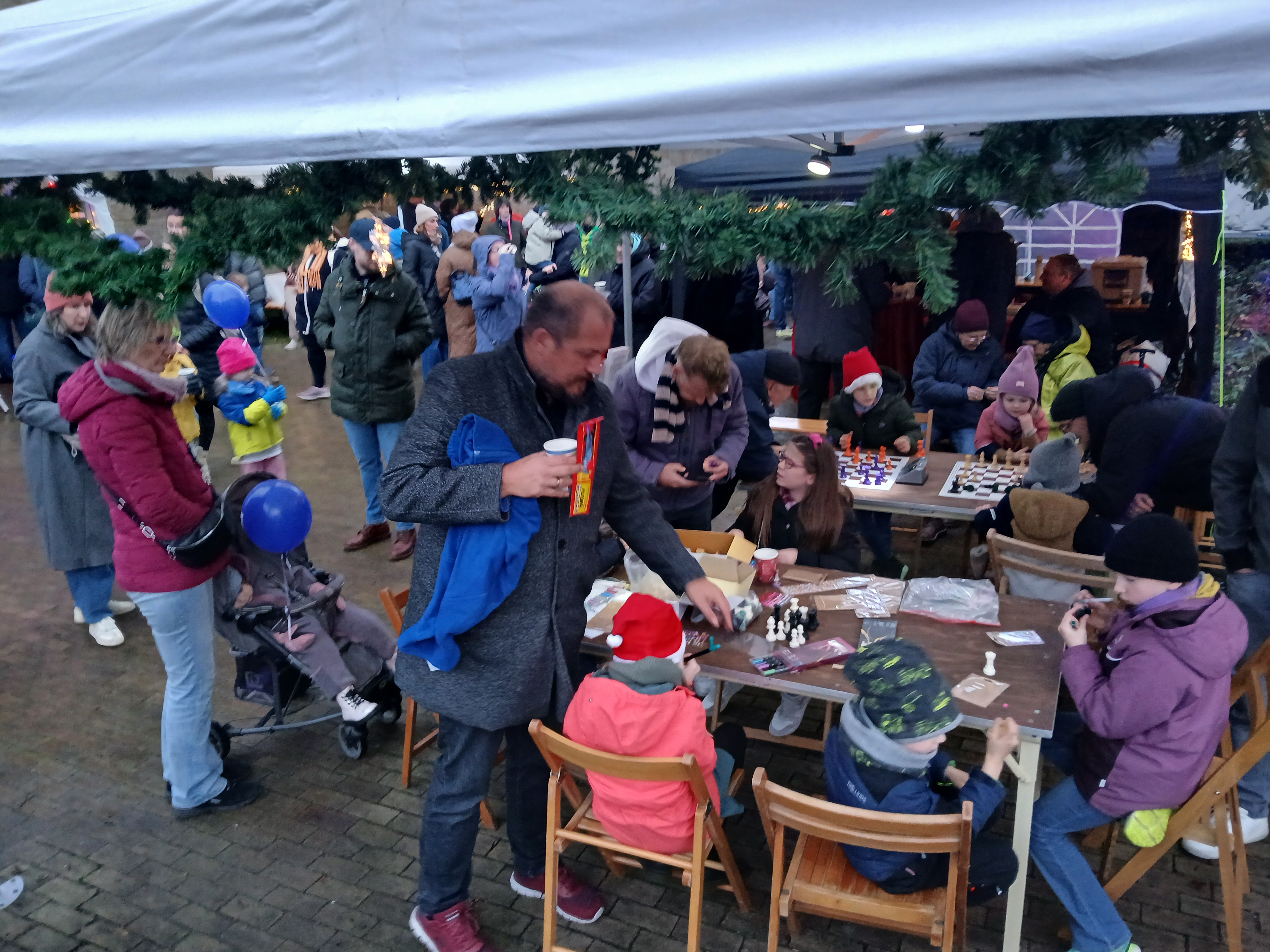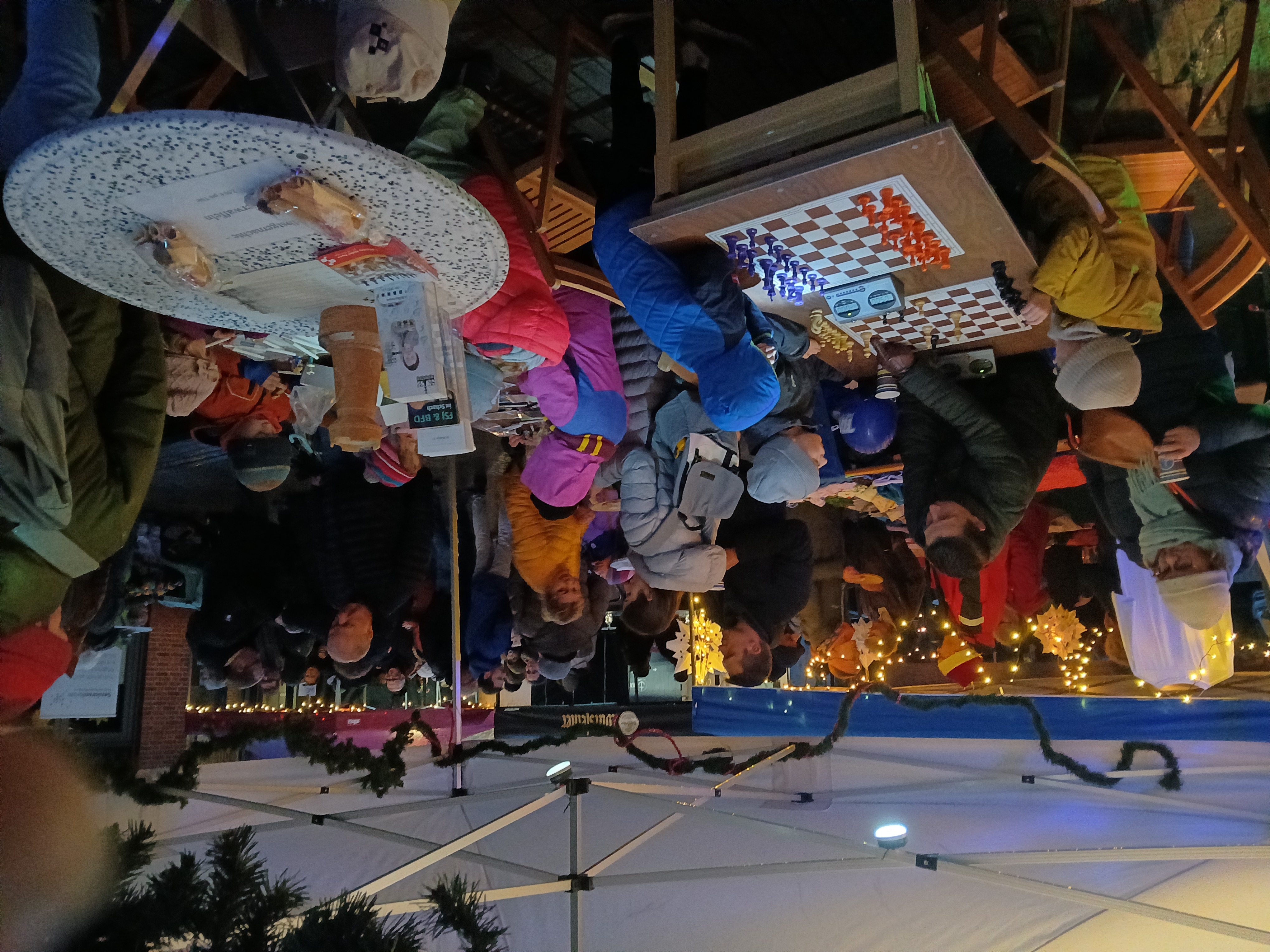 Beim Hiltruper Weihnachtsmarkt 2025 stachen wir wieder einmal zwischen Glühwein und Waffeln mit unserem Schachspiel heraus.